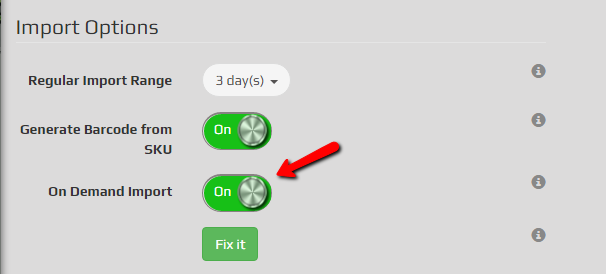 If the On Demand import option is available for a store there will be a switch displayed in the import settings for that store: