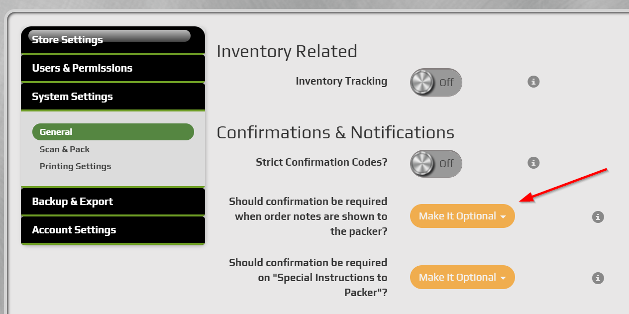 Once imported or added in the list Internal notes can be shown to the packer by enabling the option in Settings > System > Scan and Pack: