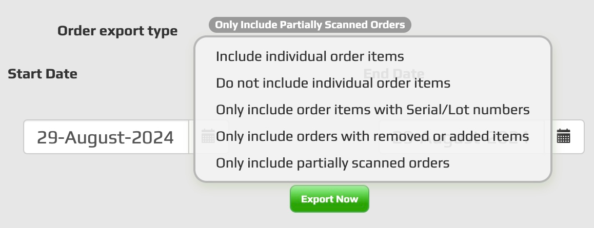 A detailed export, which lists every individual order item, including quantities, scan activity, and whether items were scanned or left unscanned