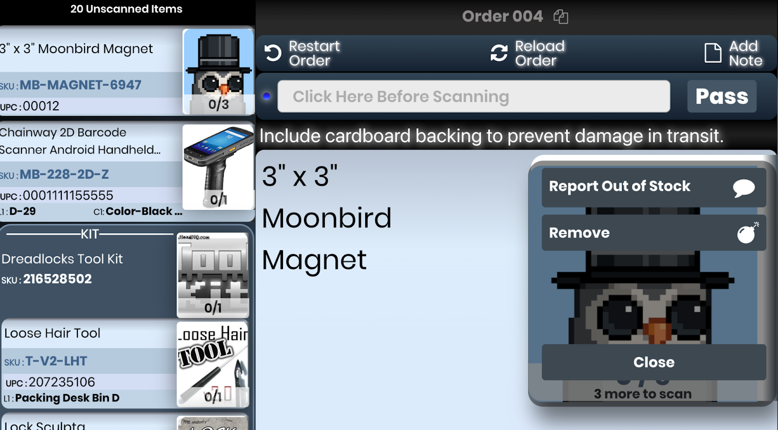 If a picker notices an item is out of stock while scanning, they can tap the menu button on the picture of the suggested item to report it. This sends a message to the email address or addresses saved in Settings, allowing your team to quickly address the shortage and avoid disruptions in the picking process.